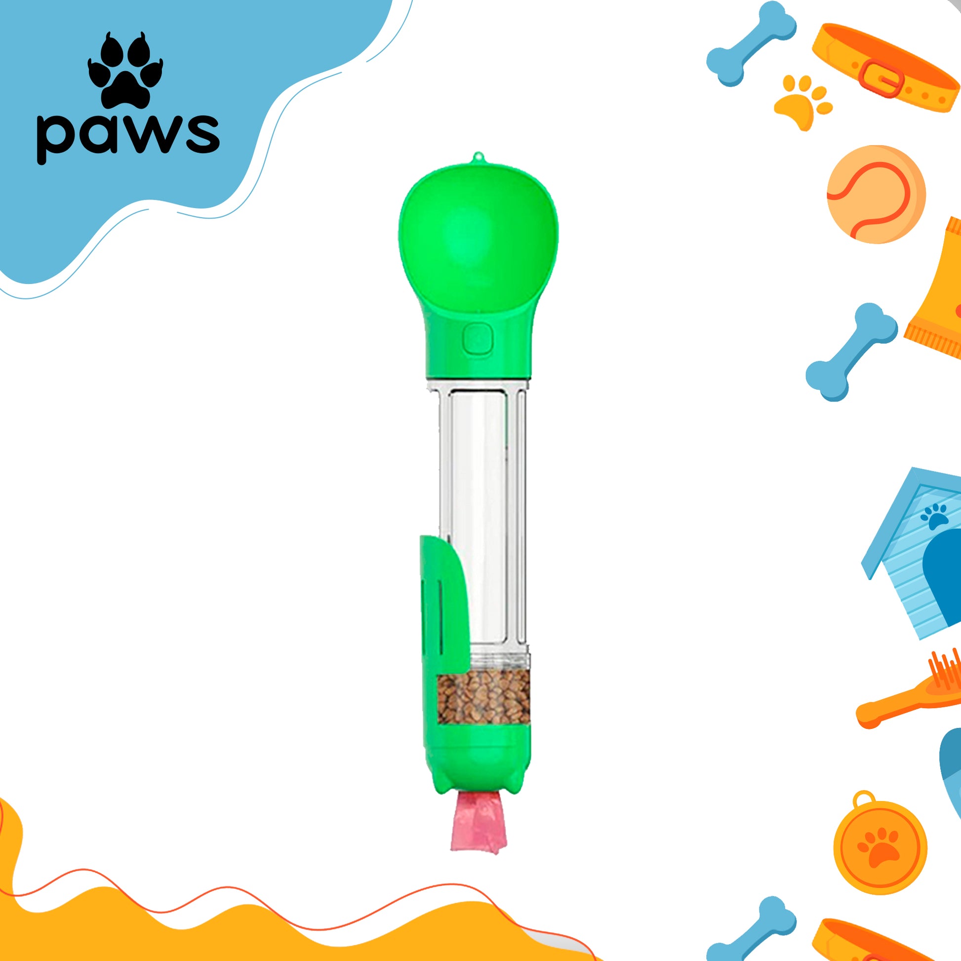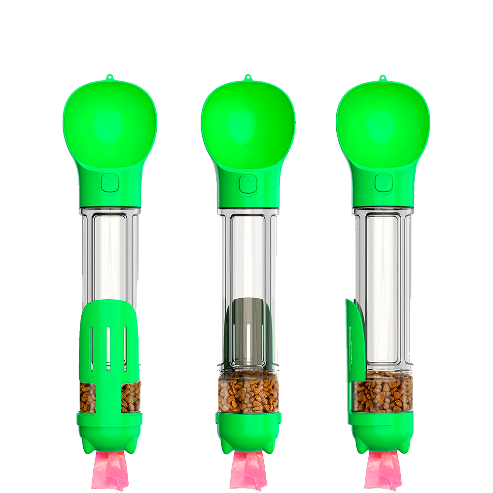 Garrafa Portátil, porta Ração, porta Saquinho plásticos e contém uma pazinha.